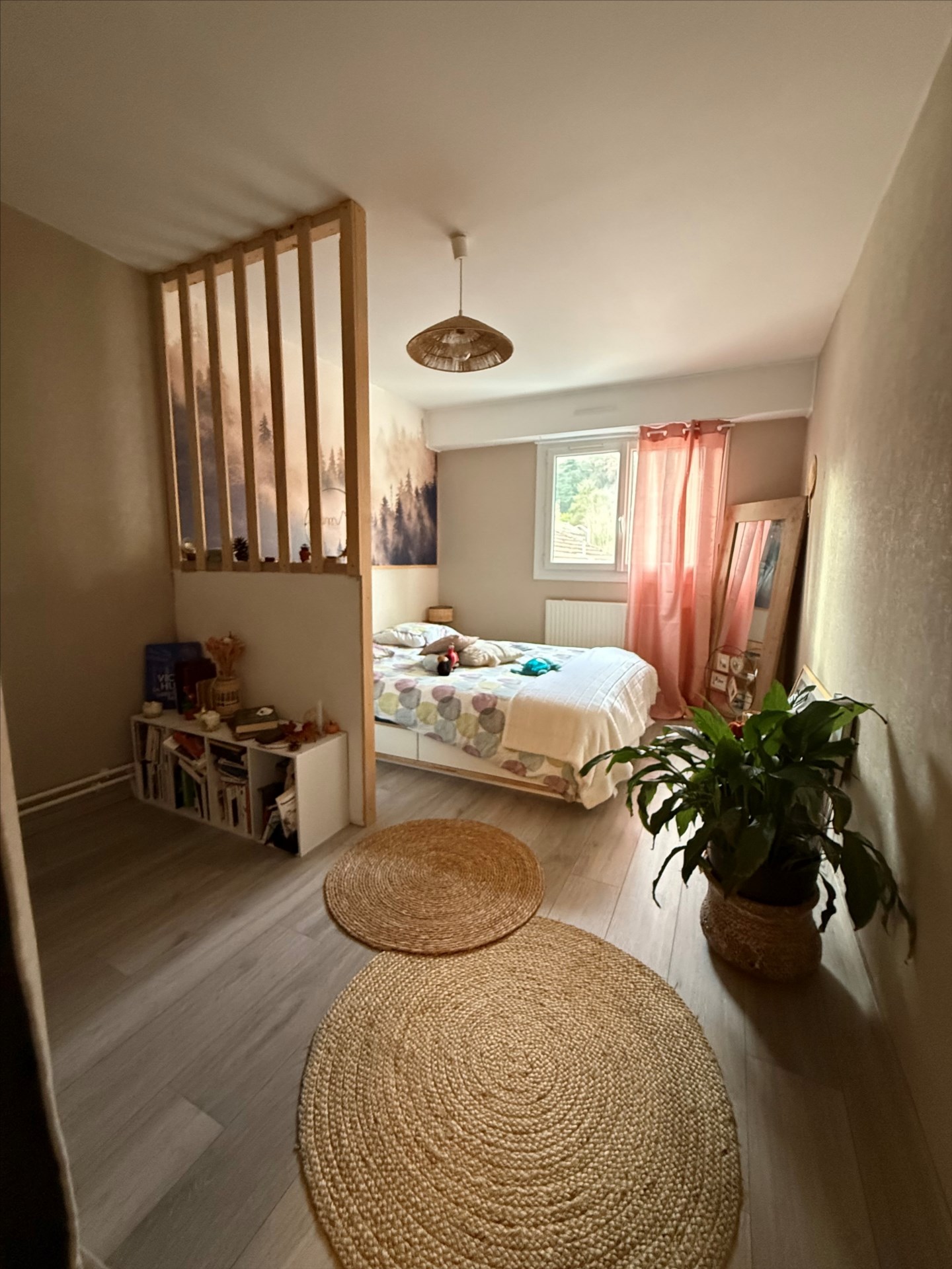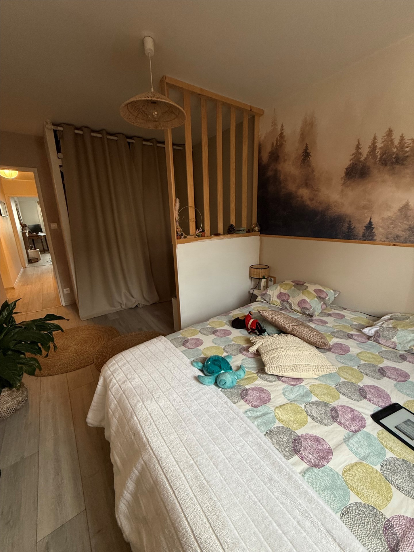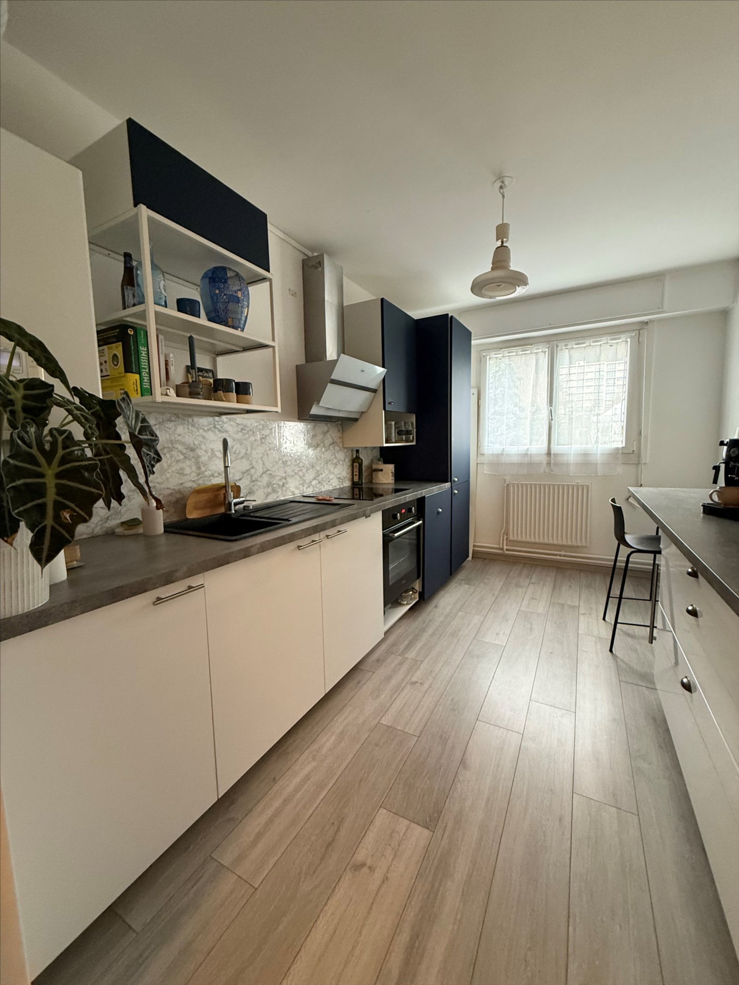 d’une entrée avec placards, une cuisine équipée (four, plaque, lave-vaisselle, hotte et frigo), un séjour avec accès balcon vue sur le parc, deux chambres dont une avec dressing aménagé, une petite buanderie, une salle de bains et WC séparé