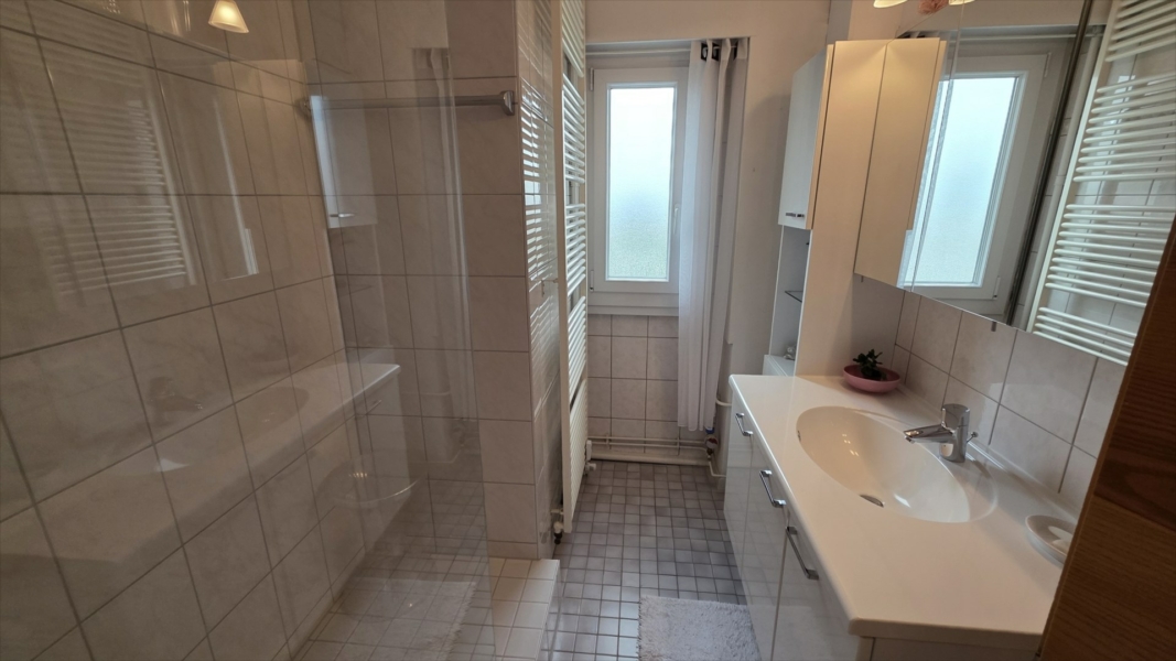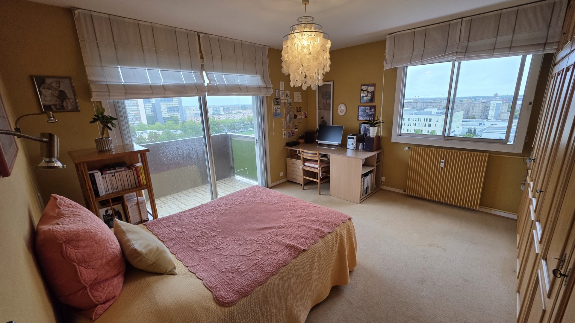 – Au 9ème étage avec ascenseur : une entrée avec placards, WC séparé, une cuisine indépendante, dégagement, vaste séjour de 40m² (possibilité d’y créer une 3ème chambre) avec accès sur un balcon offrant une belle vue dégagée, 2 chambres dont une avec balcon (11m² et 16m²) et 1 bureau (7m²), une salle d’eau.
