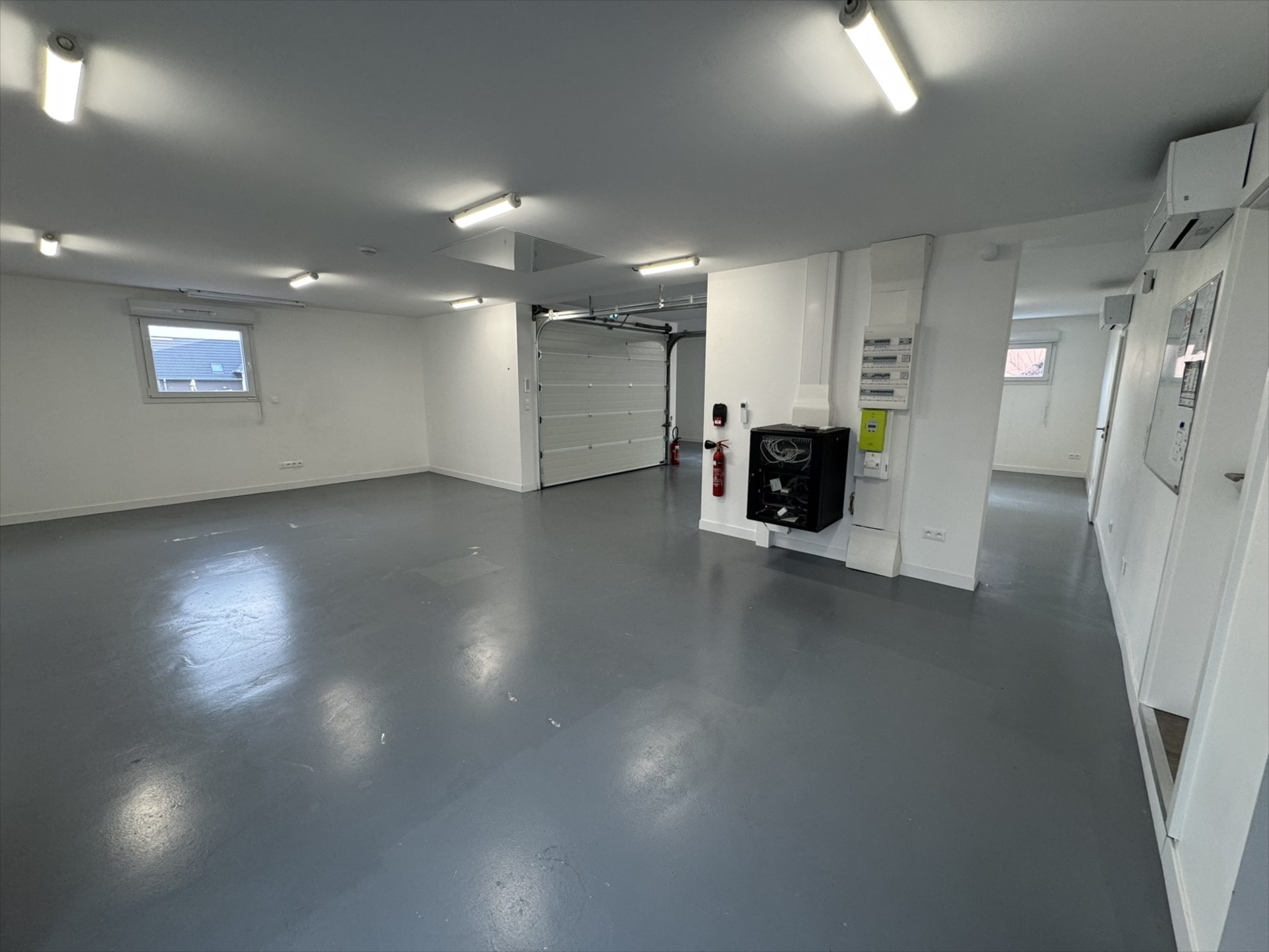 * Au rez-de-chaussée, un espace de stockage d’une surface de 46,27 m², un espace atelier d’une surface de 48,73 m² avec porte motorisée, des WC séparés.