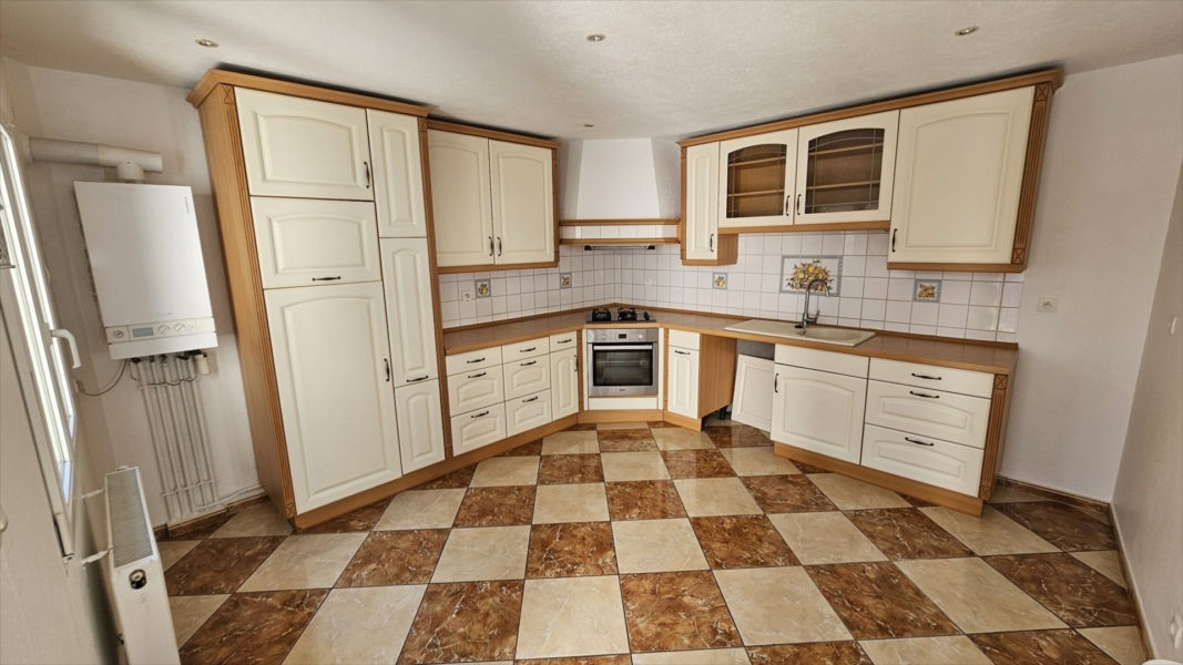 – Au rez-de-chaussée surélevé : une entrée donnant dans une grande cuisine aménagée et équipée (15m²) et une pièce de vie de 24 m².