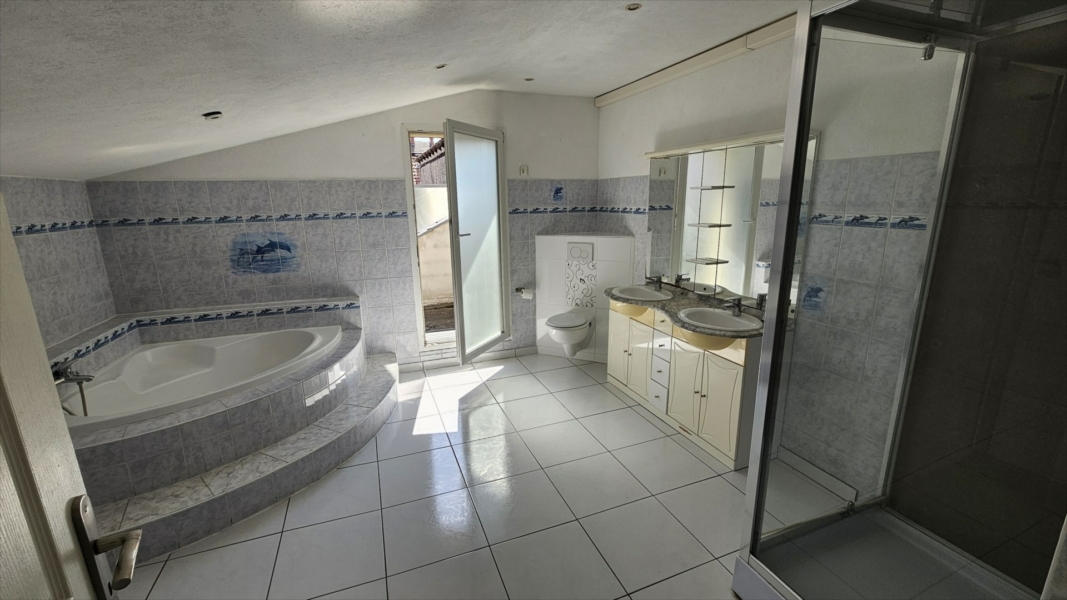 – Au 1er étage : un pallier, une chambre (14m²), un bureau (7,50m²) et une grande salle de bains avec WC (15m²) donnant accès à un balcon.