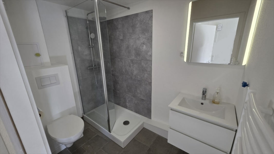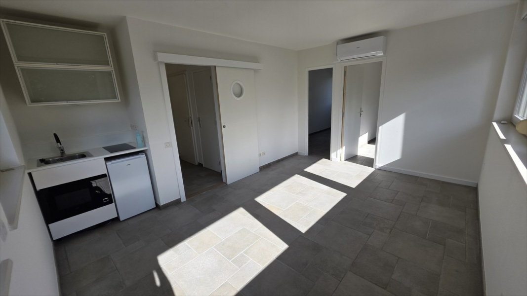 – Au 1er étage : une entrée avec placard, une pièce de vie (16m²) lumineuse avec kitchenette, 1 chambres (10m²) avec placard et un bureau (9m²), une salle d’eau avec WC. Sur le pallier, un espace buanderie privatif.