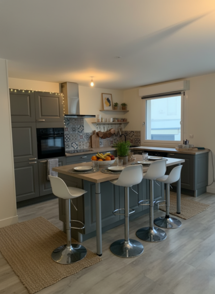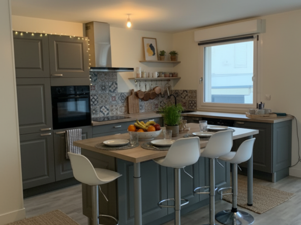 Il se compose d’une entrée avec placards, d’une cuisine entièrement équipée (réfrigérateur/ congélateur, plaques, hotte, four et lave vaisselle) ouverte sur le séjour, un dégagement, une salle de bains, WC séparé, deux chambres donnant accès sur une terrasse au calme.