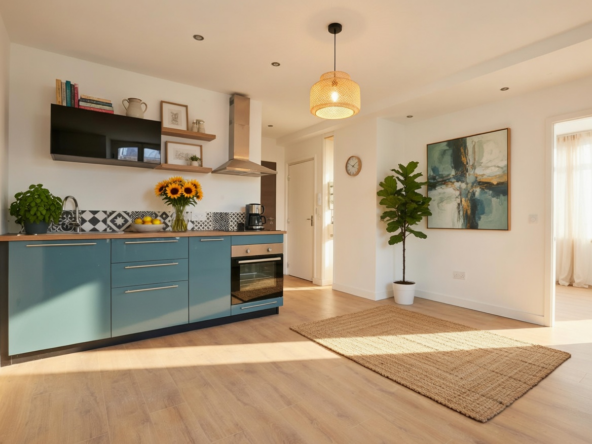 Dans Domaine privé bien entretenu, appartement F6 en duplex dans Résidence, comprenant entrée, cuisine équipée ouverte sur séjour avec accès terrasse, 3 chambres, salle de bains.