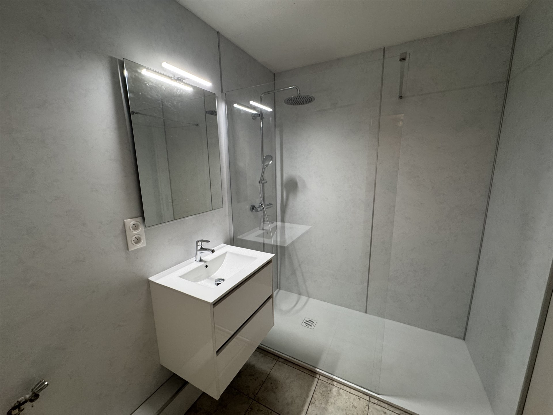 * Une salle de bains fraichement rénové avec une grande douche à l’italienne, un meuble vasque et un emplacement pour la machine à laver,
