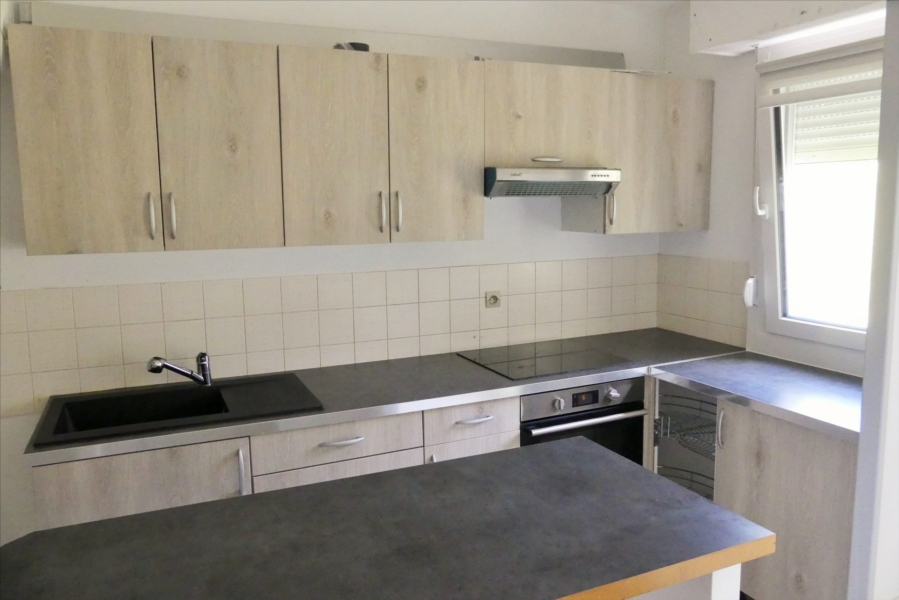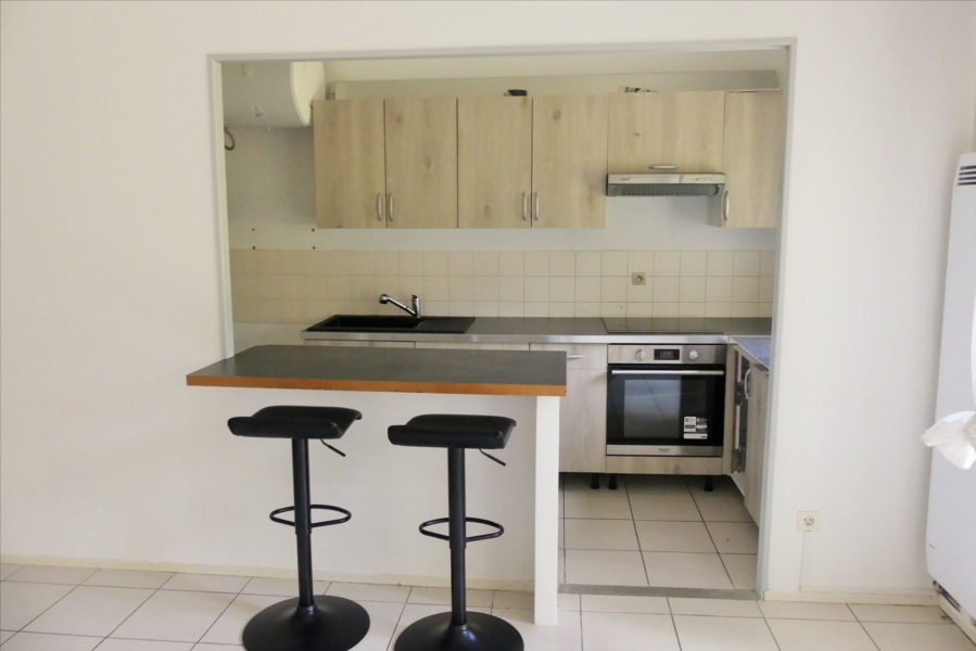 Dans petite résidence récente, appartement type F2, entrée avec placards, une cuisine équipée (plaque, four, hotte), semi ouverte sur séjour, une chambre, salle de bains,w.c